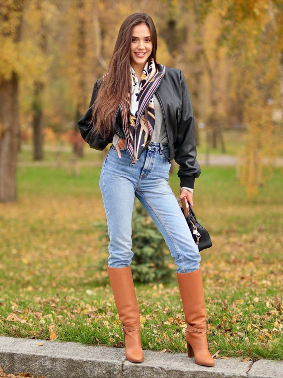 На зйомках Даша з’явилася у блакитних джинсах, сірому джемпері та чорній куртці. Образ вона доповнила шовковою хусткою, розпущеним волоссям, нюдовим макіяжем, коричневими чоботами та компактною сумочкою.