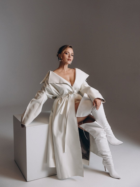 Перед об’єктивом вона постала у стильному пальті, яке приховувало її оголене тіло, а також в лакованих ботфортах на тонких підборах. Образ доповнили зібране волосся, витончений макіяж і великі срібні сережки у формі краплі.