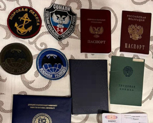 Під час обшуку у готельному номері затриманого було знайдено паспорти Росії та так званої ДНР, а також “військовий квиток” і шеврони збройних формувань агресора.