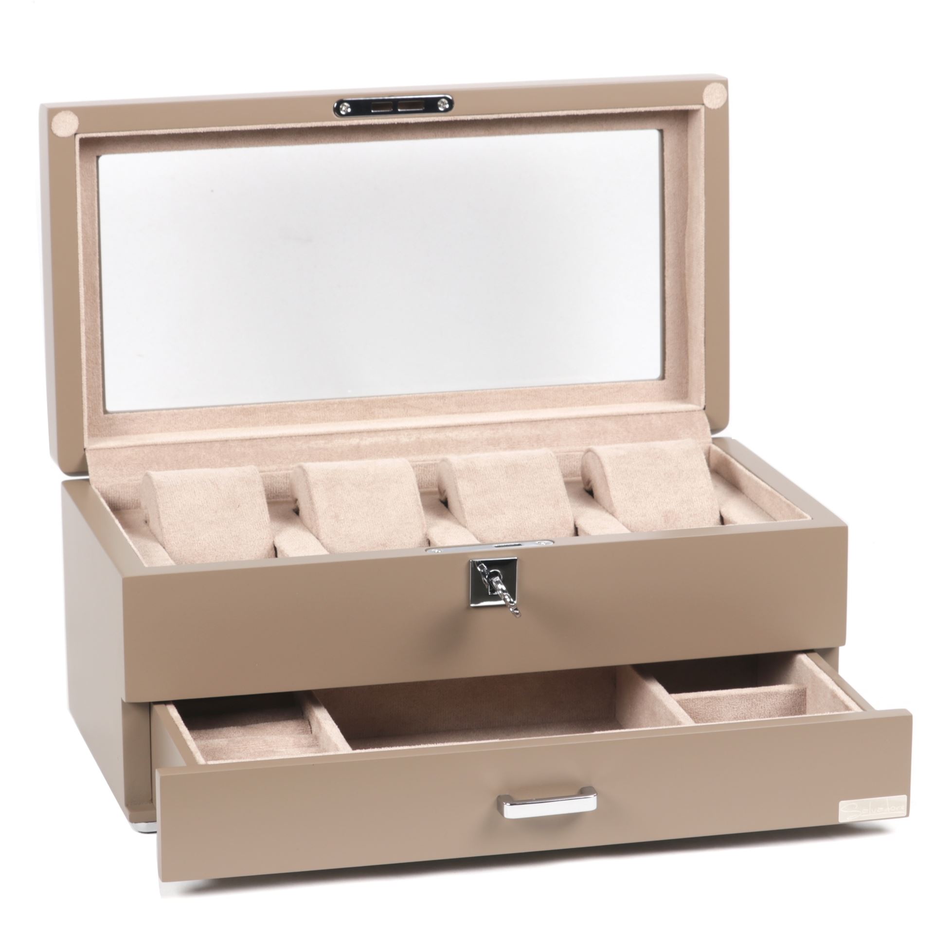 Висувні шухляди. Призначені для масивних браслетів, годинників або брошок. У деяких моделях перегородки в шухлядах можна виймати, моделюючи простір під свої потреби.