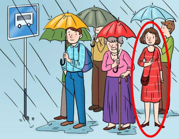 На зображенні – люди чекають автобуса під дощем на автобусній зупинці. Спочатку все виглядає добре, але це не так.