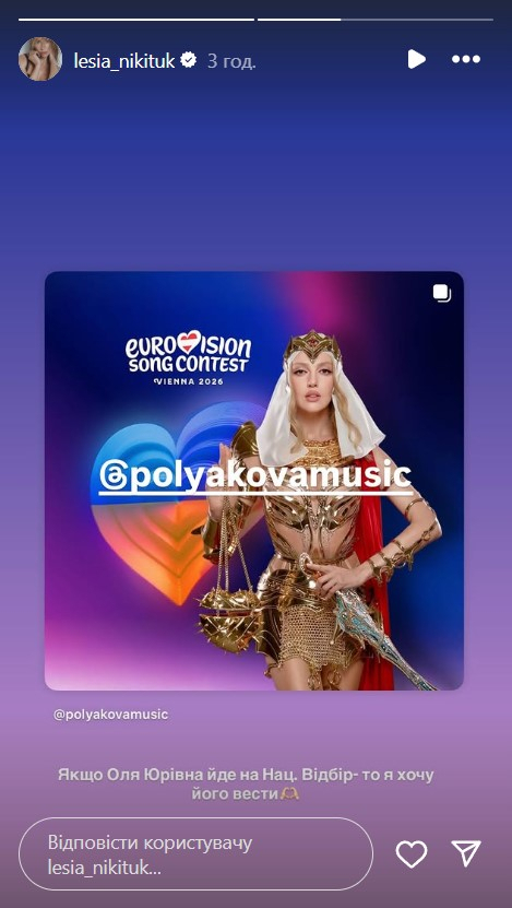 Телеведуча України Леся Нікітюк відреагувала на коментарі співачки Олі Полякової щодо участі в Національному відборі Євробачення-2026.
