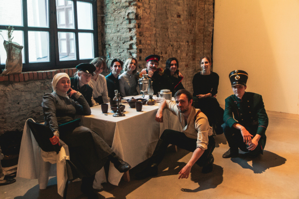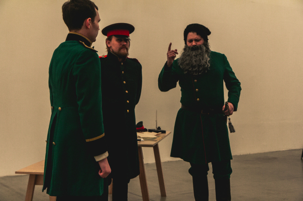 Після короткої театральної сцени переходимо до наступної зали – у трактир. Відвідувачі сідають за столами на деревʼяних лавах. Їх пригощають закусками та напоями. У невимушеній атмосфері актори зачитують рапорти про пияцтво, крадіжки, а також про самовільне відлучення з казарми майстерного арсенальної команди Івана Задніпряного, виробництво ним у казенній майстерні виробів для приватного продажу та викрадення чорної баранячої шуби у капітана.