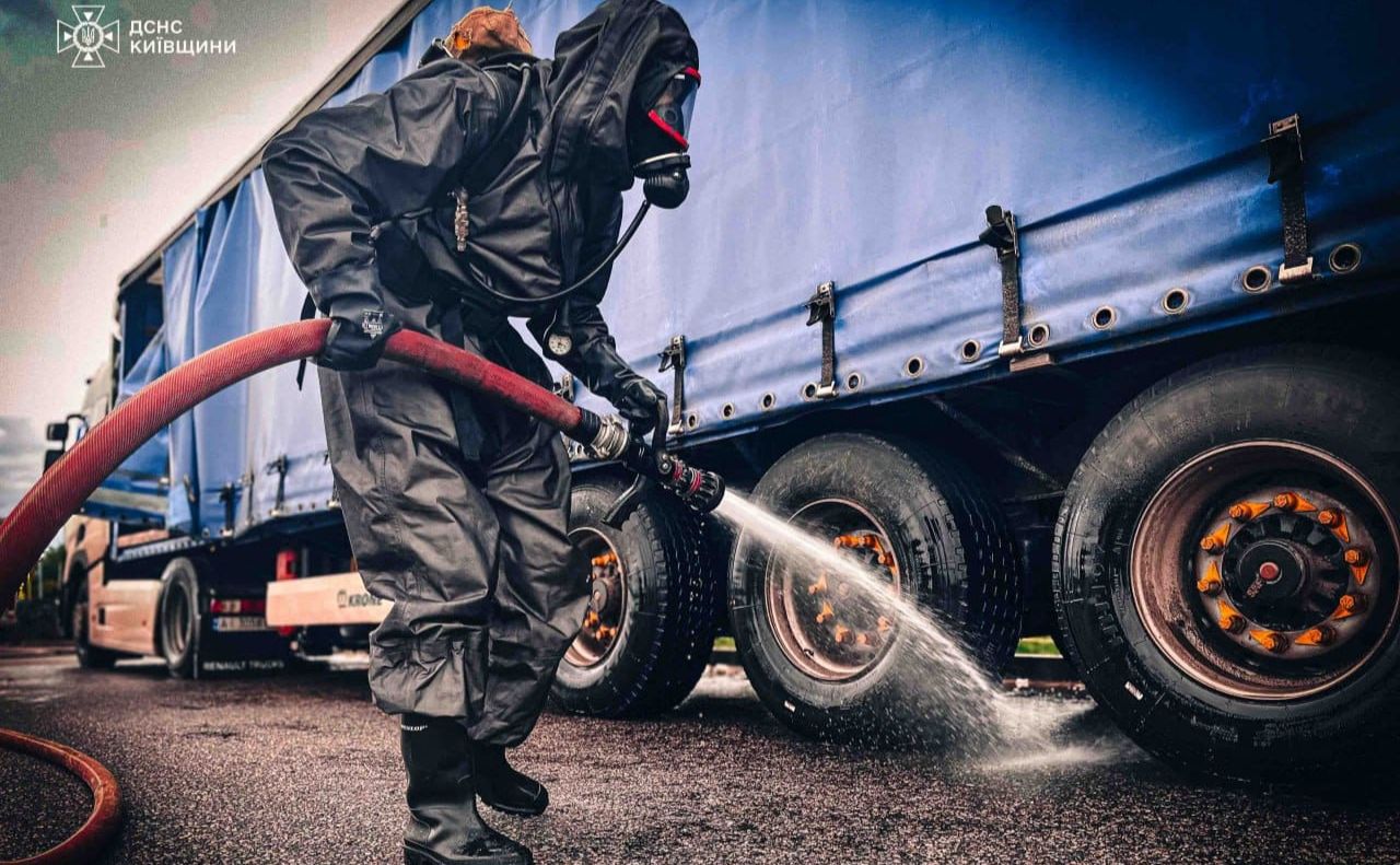 Інцидент стався в четвер, 16 жовтня, у селі Росава, знаходячись в Обухівському районі. Рятувальники отримали повідомлення про витік азотної кислоти з вантажу фури. Про це повідомляють у ДСНС Київщини.