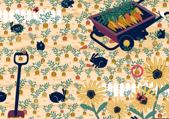 На зображенні показана ферма. На ній – кілька соняшників, повна тачка моркви та кілька кроликів, які ласують морквою, яку ще не встигли викопати із землі. У цій картинці захований маленький діамантовий перстень.