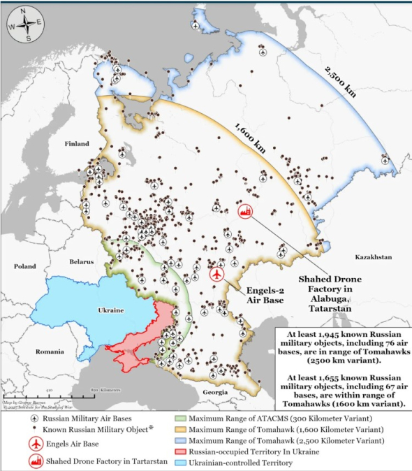 Водночас Інститут вивчення війни вважає, що американські далекобійні ракети Tomahawk можуть суттєво зашкодити ключовим російським військовим об’єктам, що перебувають глибоко в тилу ворога.