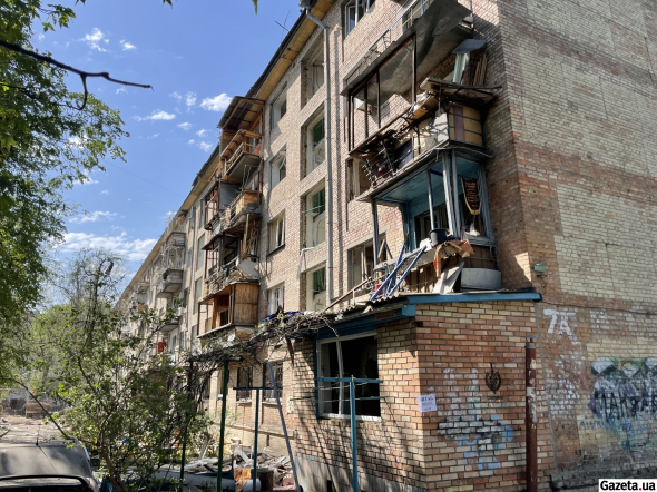 За вщент зруйнованим будинком стоїть цегляна пʼятиповерхівка. У тіні щойно зазеленілих дерев валяються уламки, стоять зімʼяті й машини без скла. Будинок після ракетного удару залишився без вікон, балконів і дверей. У садках червоним майорять тюльпани.