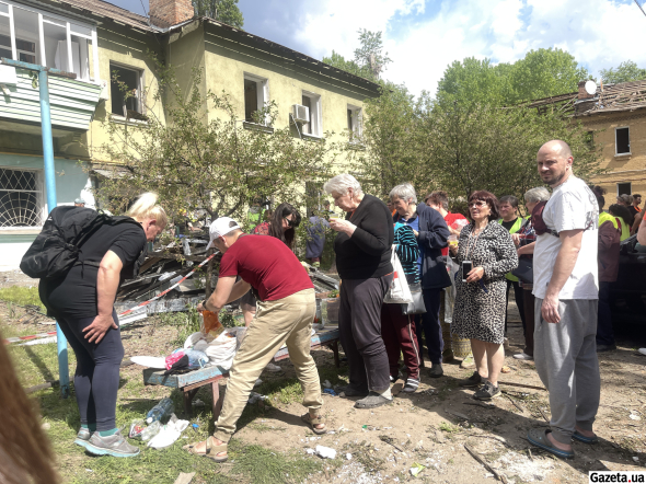 На стелі однієї з уцілілих квартир ще висить люстра – її видно крізь вибите вікно. Там досі стоїть холодильник з десятками магнітів. Біля вантажівки – черга. Там роздають панелі ДСП. Люди передають одне одному пакунки з речами, розбирають купи одягу, шукають документи, ліки.