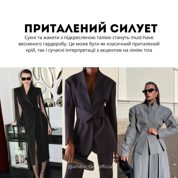 Сукні та жакети з приталеною талією стануть must-have весняного гардеробу. Це може бути як приталений крій, так і сучасні інтерпретації з акцентом на лініях тіла.