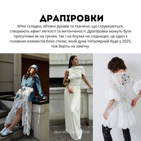 М’які складки, об’ємні рукави чи тканини, що струмкуються, створюють ефект легкості та витонченості. Драпіровки можуть бути присутніми як на сукнях, так і на блузах чи спідницях. Це один з головних елементів бохо стилю, який буде дуже популярним у 2025 році.