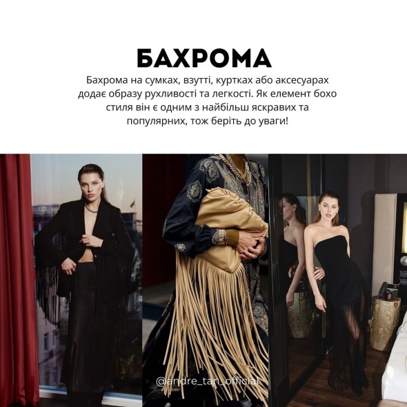 Бахрома на сумках, взутті, куртках або аксесуарах додає образу рухливості та легкості. Як елемент бохо стилю він є одним з найбільш яскравих та популярних.
