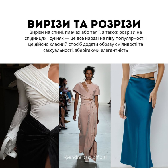Вирізи на спині, плечах або талії, а також розрізи на спідницях і сукнях на піку популярності. Це вдалий спосіб додати образу сміливості та сексуальності, зберігаючи елегантність.