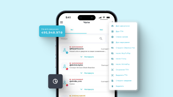 Блок “Задачі” – це не окремий таск-менеджер, а інструмент, вбудований у контекст замовлень і чатів. З картки задачі є прямий перехід до пов’язаного чату або замовлення. Авто-створення задач при зміні статусу замовлення – менеджер отримує нагадування автоматично, без ручного виставлення.