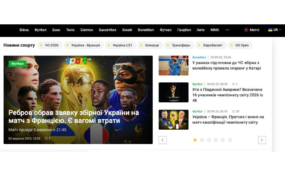 - Зручність навігації. Структура сайту проста та зрозуміла: новини розділені за видами спорту, лігами та змаганнями.