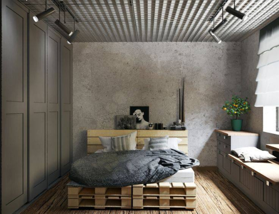 Лофт перетворює спальню на сучасне простір з відкритими полицями, металевими акцентами та мінімумом зайвого декору.
