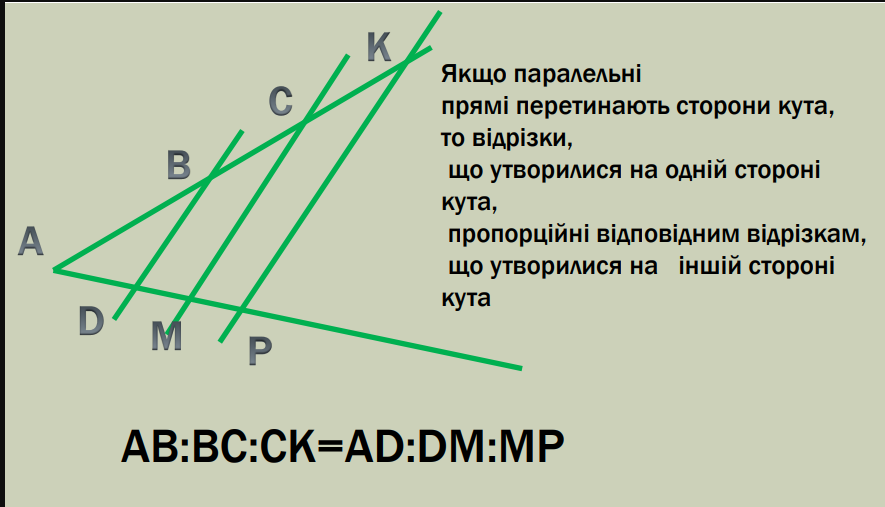 Паралельні прямі, що перетинають сторони кута, відтинають на них пропорційні відрізки.