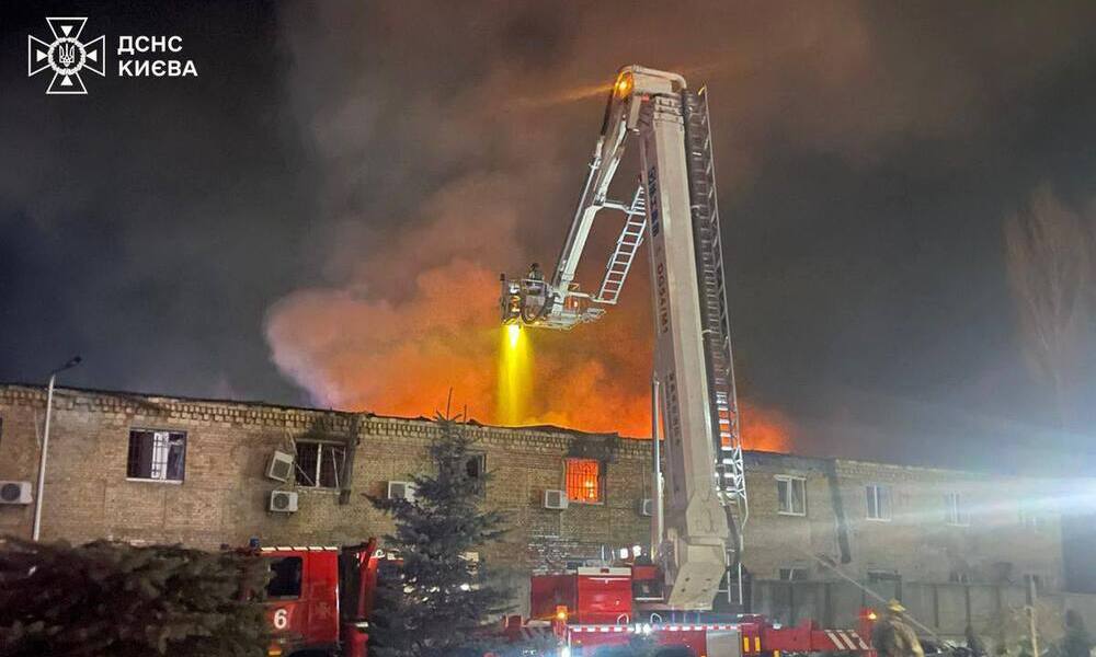 В Оболонському районі пошкоджено офісну будівлю, виникла пожежа в конструкціях та у припаркованих автомобілях. Під час повторного обстрілу постраждали четверо медиків.
