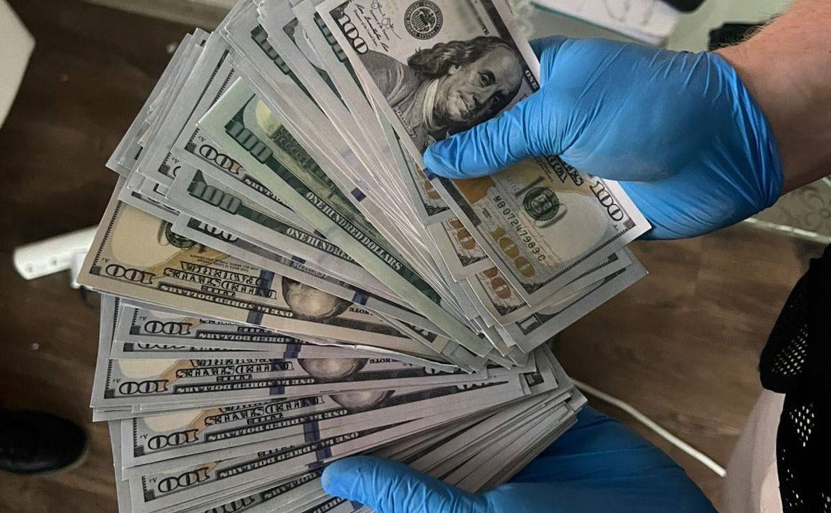 На фотографії поліція продемонструвала «віяло» з доларів, яке тримав експерт. Це частина хабаря — 15 тисяч доларів, які організатор отримав від клієнта за свої «послуги». Правоохоронці затримали порушника.