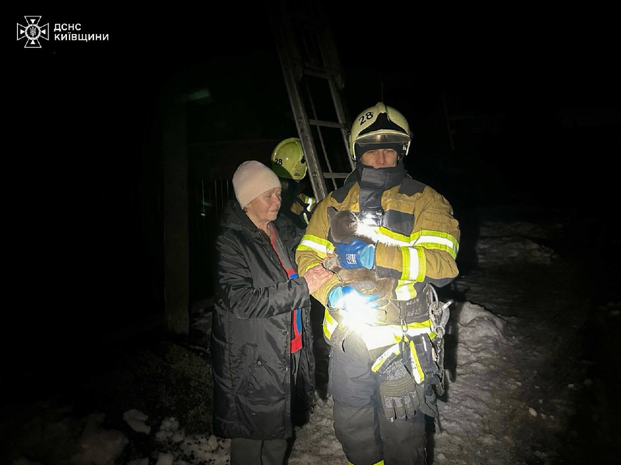 На допомогу прибули рятувальники 28-ї ДПРЧ м. Яготин разом із бригадою електриків. Використавши висувну драбину, вони безпечно зняли тварину та передали господині.