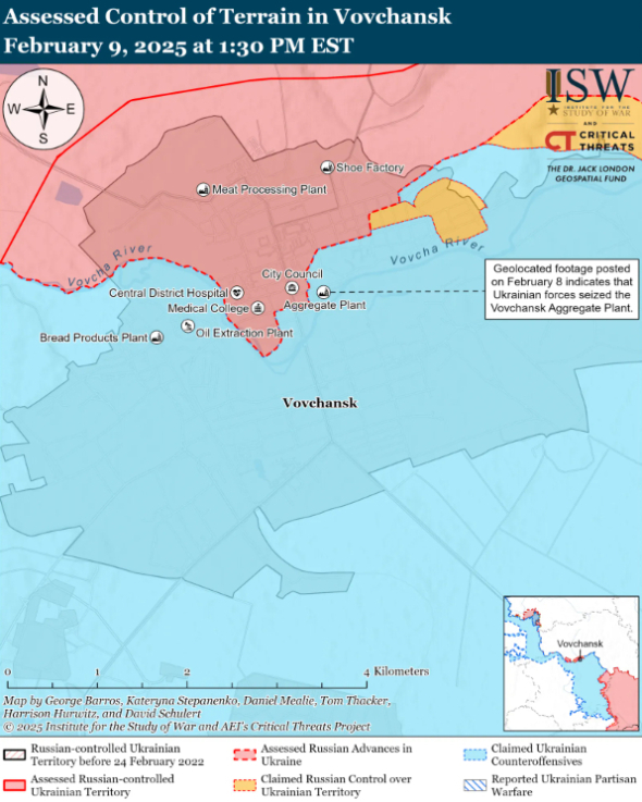 Згідно з інформацією аналітиків, які посилаються на геолокаційні кадри, в межах Харківського напрямку українські війська просунулися поблизу Вовчанська на тлі того, коли й окупанти проводили атаки в районі міста 8 і 9 лютого.