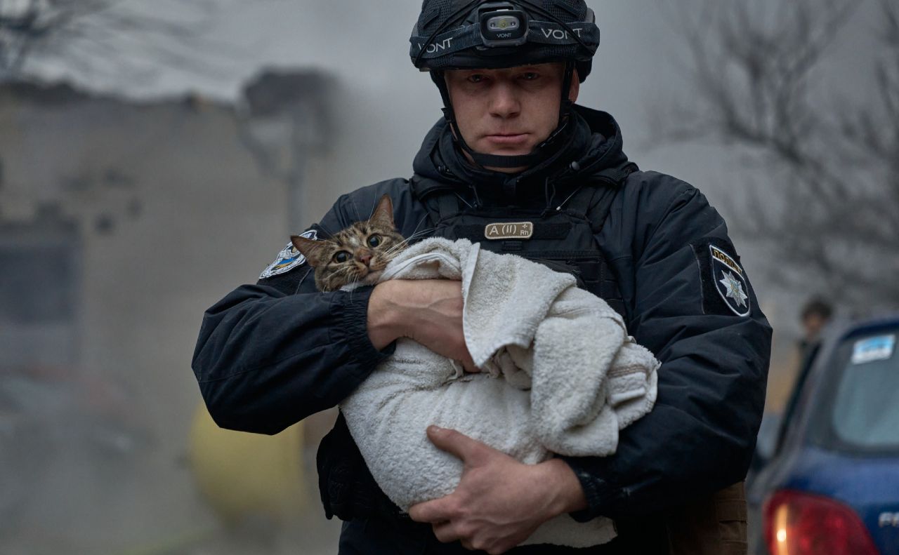 Поліцейський рятує кота після обстрілу Києва. У цьому дотику — не лише збережене життя, а й символ нашої людяності, за яку ми боремося.
