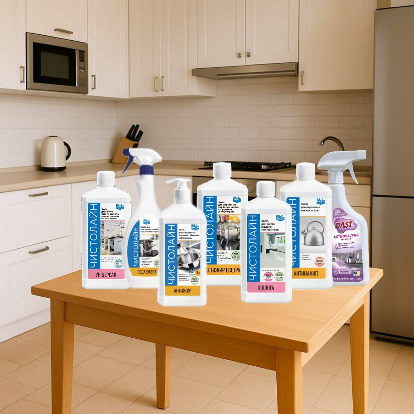 - Побутова хімія — мийні засоби для загальної чистки приміщень, посуду, текстилю, поверхонь тощо.