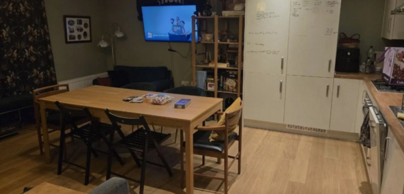 У центрі видно дерев’яний обідній стіл зі стільцями та предметами повсякденного вжитку. Ліворуч, у затишній вітальні, розташований диван навпроти телевізора на стіні.