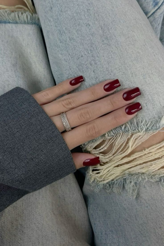 Винний колір – це тренд, який залишиться актуальним і взимку. Цей відтінок підкреслює витонченість пальців і прикрас на них.